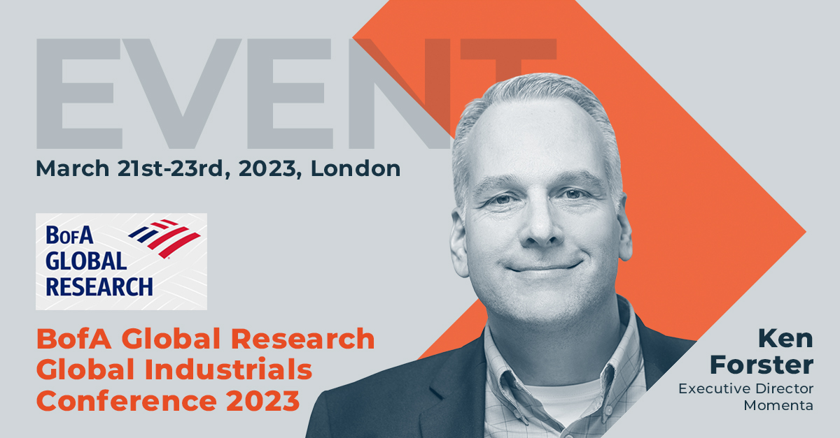 We're excited to share that Ken Forster, Momenta's Executive Director, will be participating in the annual BofA Global Research Global Industrials Conference in London, which runs from March 21st to March 23rd.